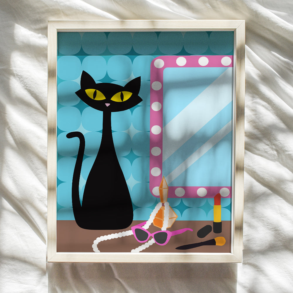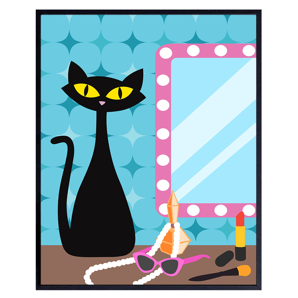 Mid Century Cat Wall Decor - Cute Cat Gifts for Women, Woman, Cat Mom, Girl - Cat Stuff Blue Bathroom Decor - Minimalist Cat Wall Art - Modern Bathroom Wall Decor for Women - Black cat Lover Gifts