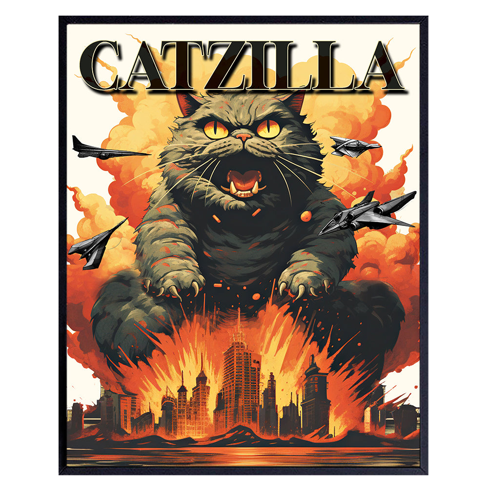 Funny Cats Wall Art & Decor - Catzilla - Black cat - Funny Cat Poster - Cat Gifts for Men, Cat Dad, Boys' Bedroom, Man cave Decor - Mens Cat Wall Decor - Horror Movie Poster - Japanese Wall Art Print