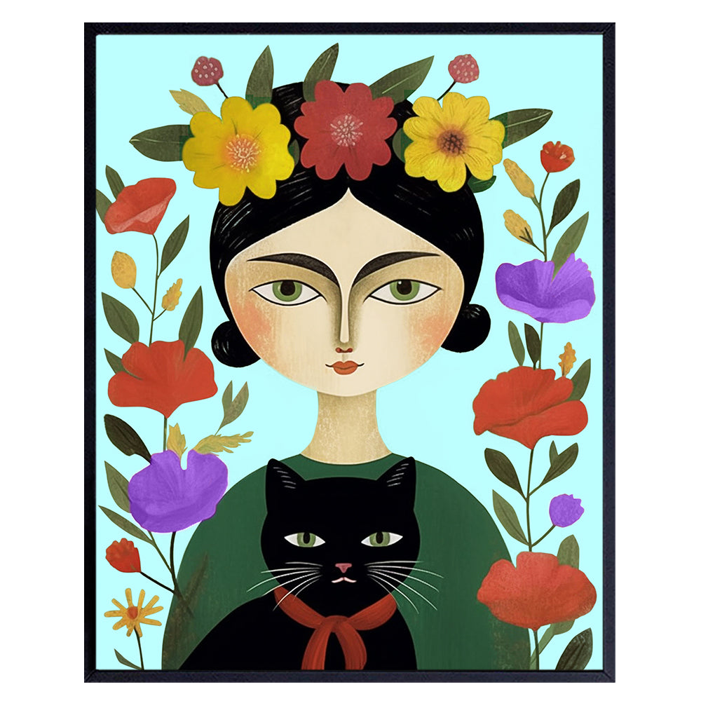 Cat Decor Frida Mexican Decor - Frida Poster 8x10 - Black cat Wall Art - Mexican Folk Art - Cute Cat Wall Decor - Mexicans Art - Cat Gifts for Women - Cat Mom, Cat Themed Gifts - Cat Lover Gifts