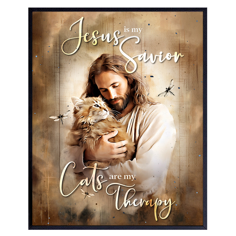 Christian Decor, Cat Wall Art & Decor - Jesus Christ, Cat Lover, Cute Cat, Christian Poster - Christian Gifts for Girls, Cat Mom - spiritual Religious art Christian Quote- Rustic Farmhouse Home Decor
