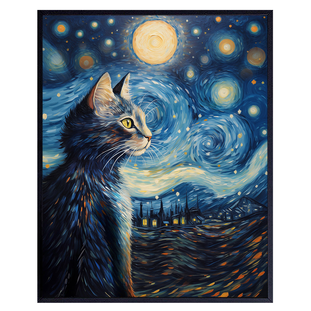 Black cat van Gogh Wall Art - Vincent van Gogh Starry Night - Cute Cat Wall Decor for Cat Mom - Cat Themed Gifts for Women - Cat Decor - Cat Stuff Cat Lover Gifts Cat Room Decor - van Gogh Poster