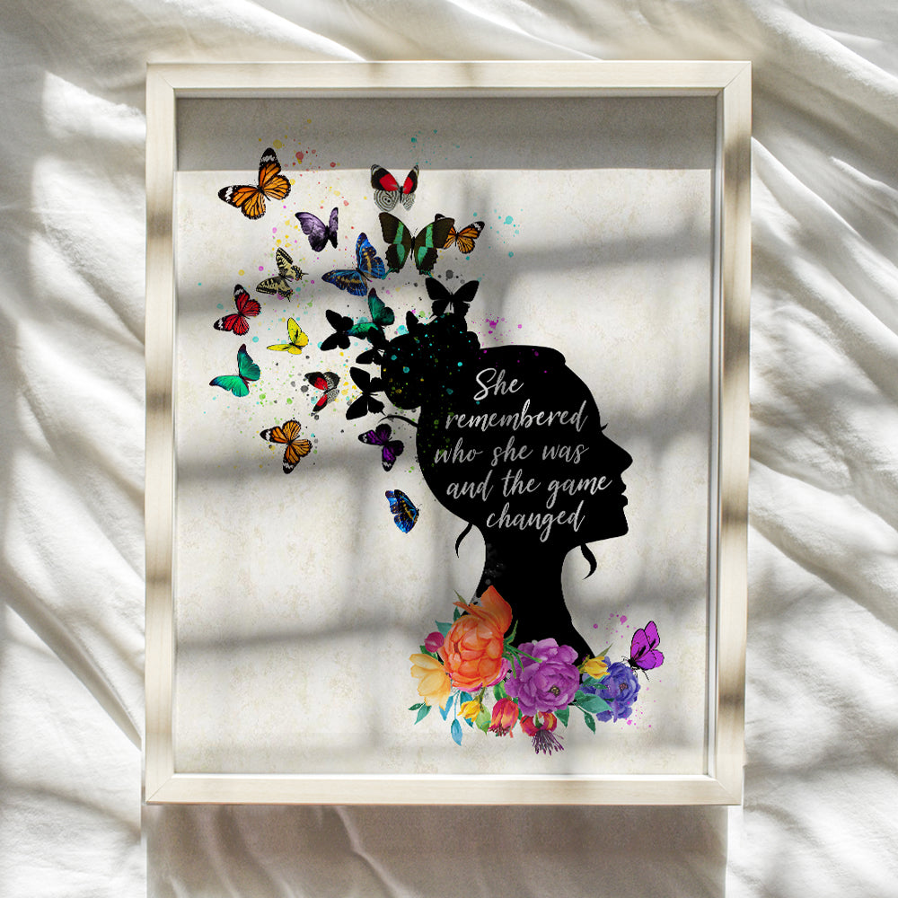 She Remembered Who She Was and The Game Changed Wall Art Poster 11x14 - Uplifting Inspirational Positive Quotes - Motivational Encouragement Gifts for Women, Girls Room, Bedroom - Butterfly Wall Decor