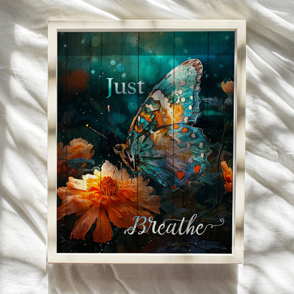 Butterfly Just Breathe Wall Art - Inspirational Gifts for Women, Teen Girls - Farmhouse Wall Art Print - Positive Quotes Posters - Shabby Chic Wall Decor - Rustic Bedroom Decor - inspiring Wall Art