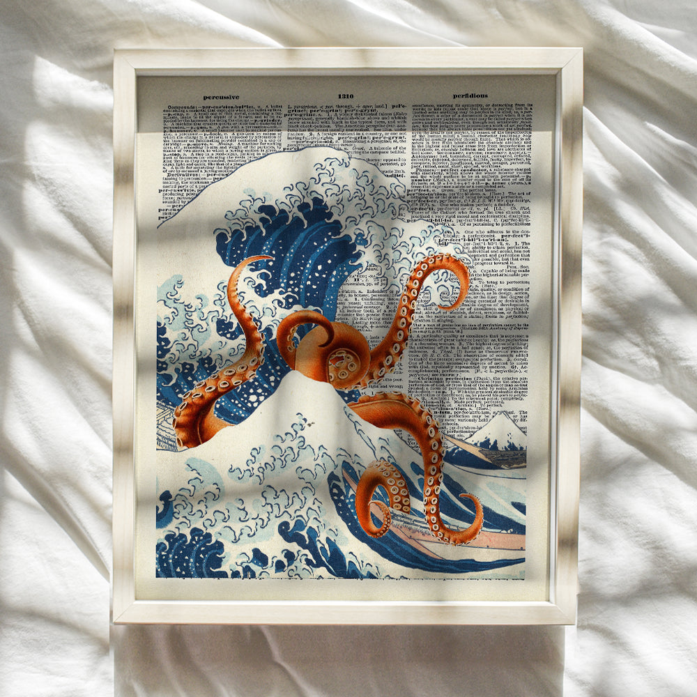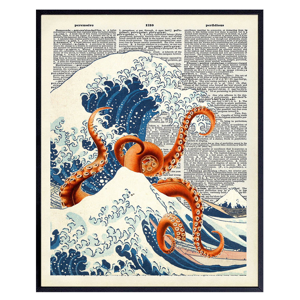Kanagawa Wave Octopus Wall Art - Retro Ocean Themed Home Decoration for Office, Apartment, Beach house, Living Room, Bedroom - Japanese Art - Eclectic Trendy Goth Wall Decor, Coastal Beach Theme
