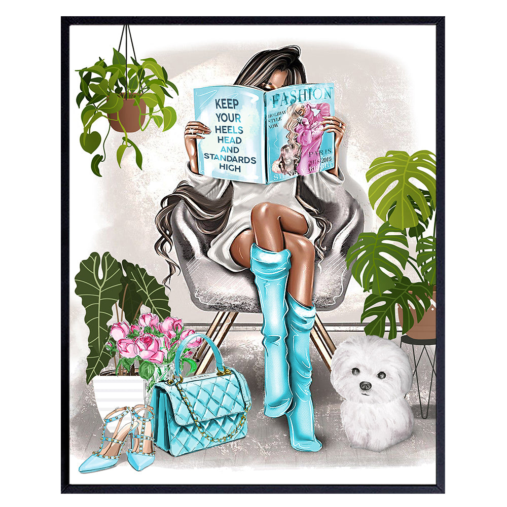 Glam Girls Bedroom Wall Art - Living room, Teen Room - Blue Designer Wall Decor for Girls - Daughter gifts - Housewarming Gifts for Women - Black Girl, African American Woman Poster Picture