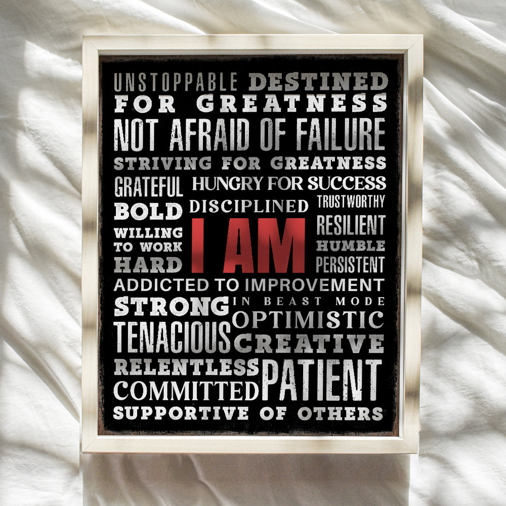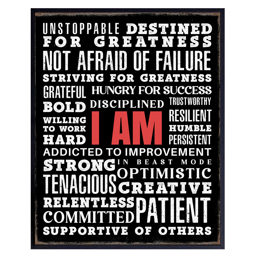 I Am Motivational Wall Art - positive Affirmations Man cave Wall Decor - Inspirational Quotes Wall Decor for Men - Home Office Encouraging Gifts - Workplace Success Wall Art - Inspiring Wall Art