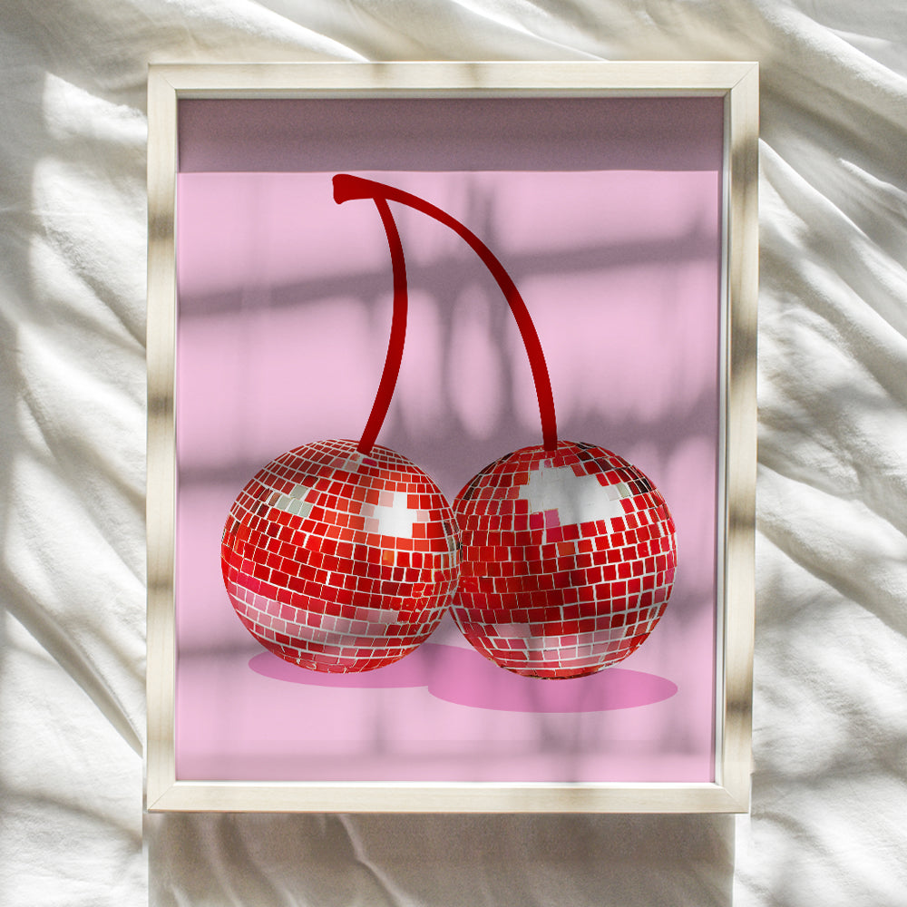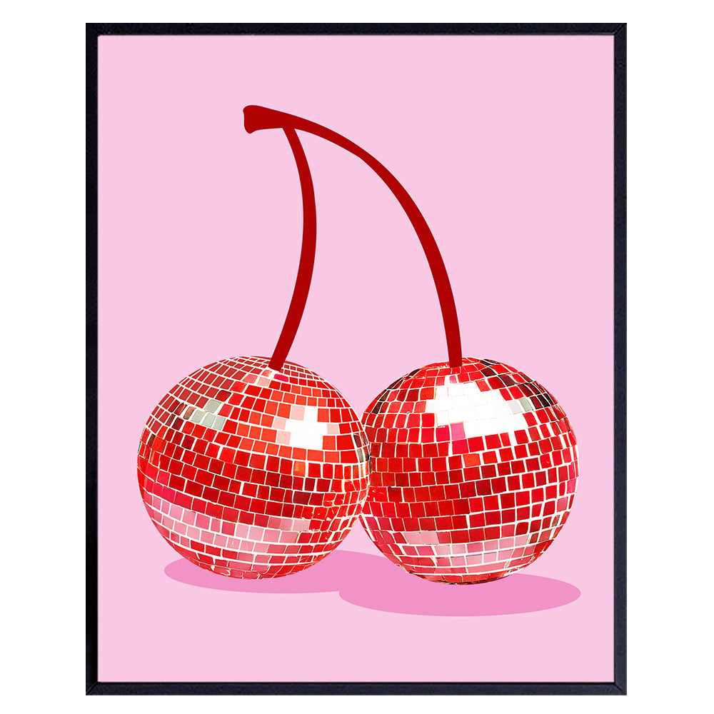 Disco Ball Cherry Decor - 70s 80s Wall Decor for Women Girls - Aesthetic Room Decor - Vintage Retro style Gallery Wall Art - Teen Room Decor - Preppy Trendy Funky Mid-century modern Living room Decor