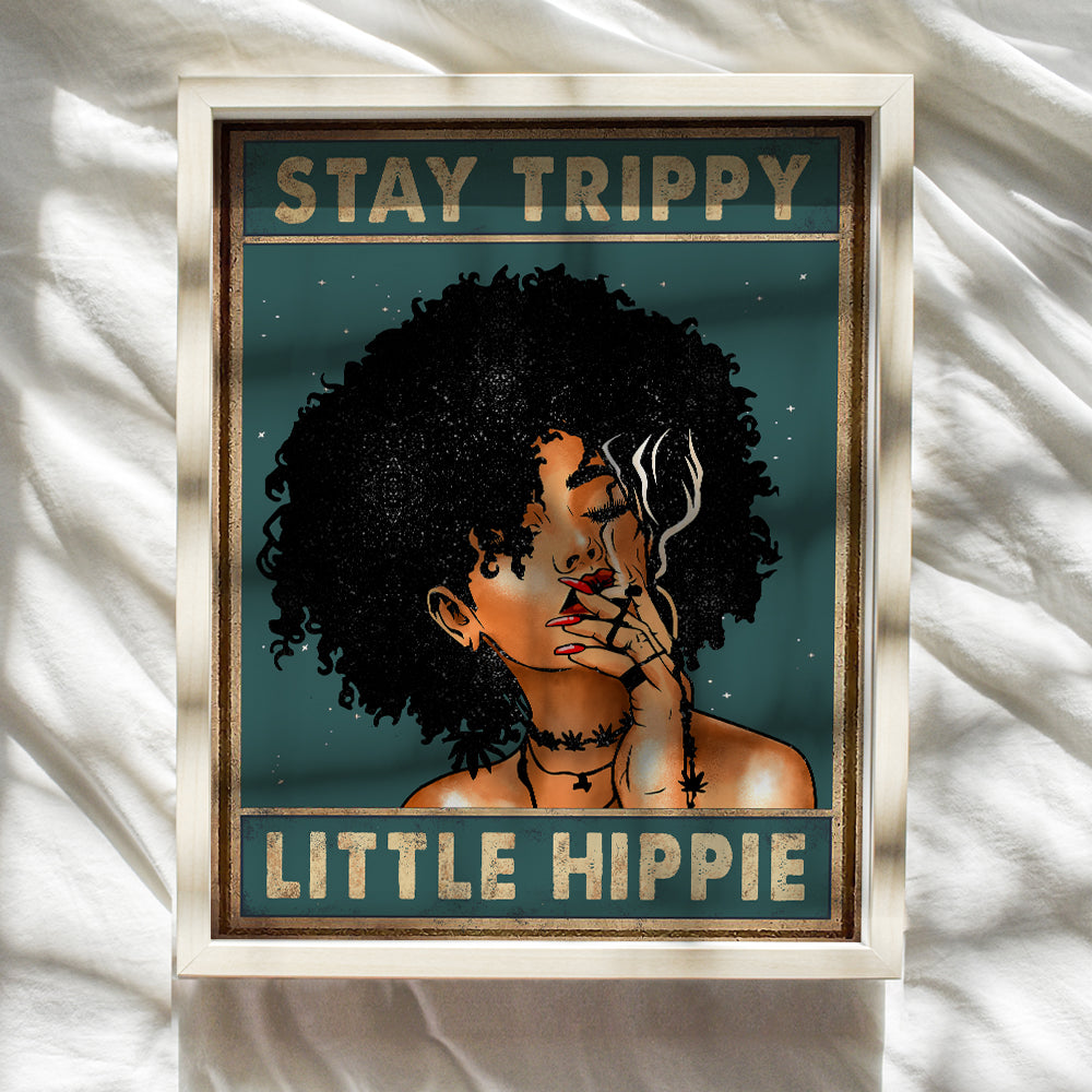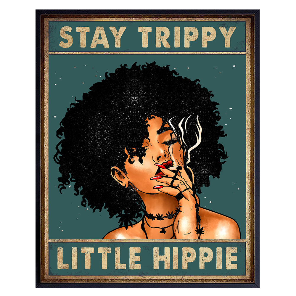 Trippy Wall Decor - Stay Trippy Little Hippie Wall Art - Dope Posters - Black Art - Afro African American Women, Woman - Stoner Pothead Gifts - Smoking Marijuana Poster, 8x10 - Ganja Weed Decorations