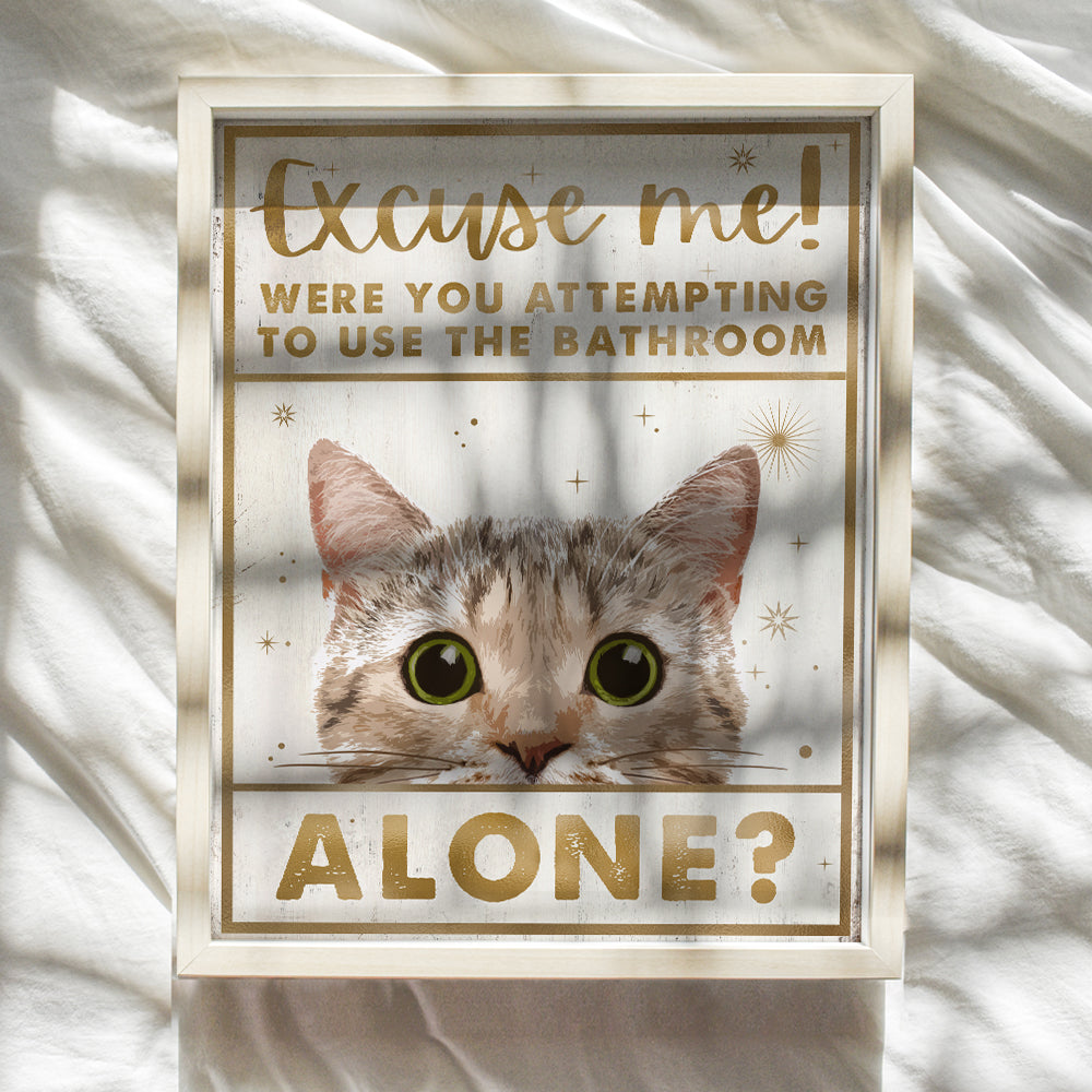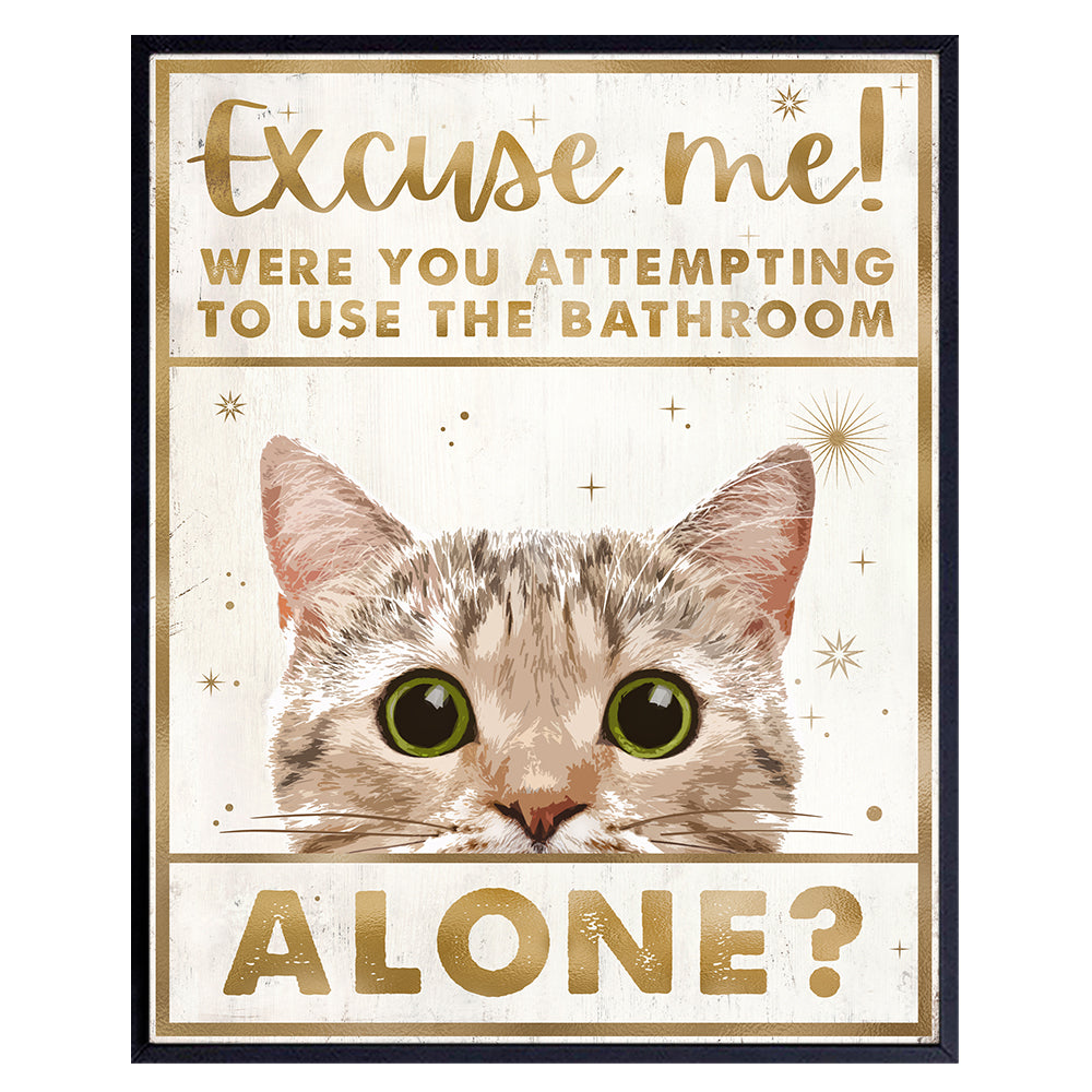 Excuse Me Cat Bathroom Wall Art - Funny Bathroom Wall Decor - Guest Bathroom Accessories - Bath Wall Decor - White Gold Bathroom Decorations for Women Kitty Kitten Cat Lover - Powder room Wall Art