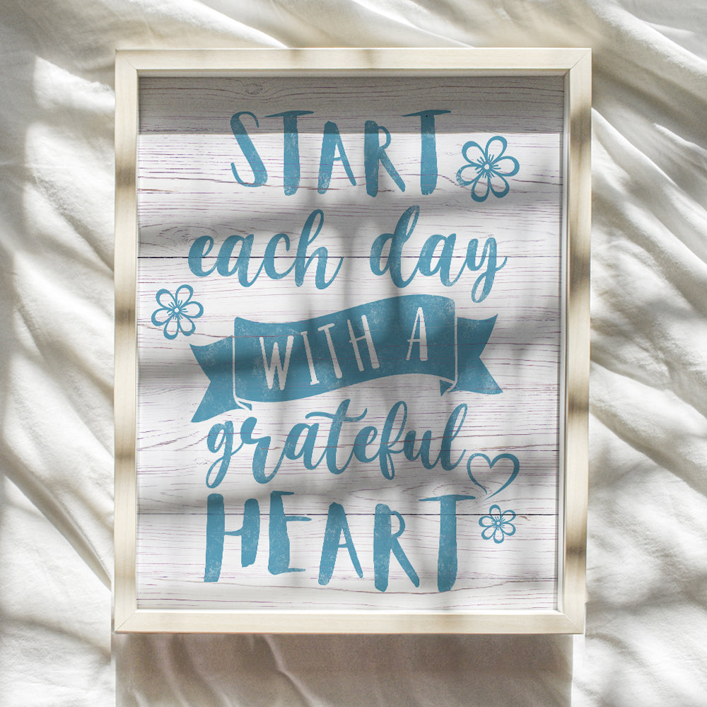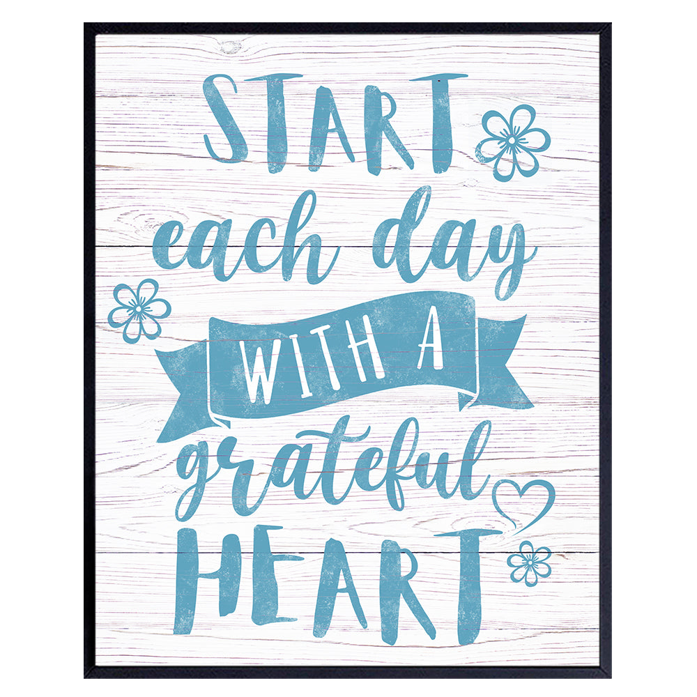 Rustic Inspirational Quotes Wall Art - Start Each Day With A Grateful Heart Sign Wall Decor - Blue Motivational Wall Art Posters - Positive Quotes Sayings - Cute Encouragement Gifts for Women Unframed