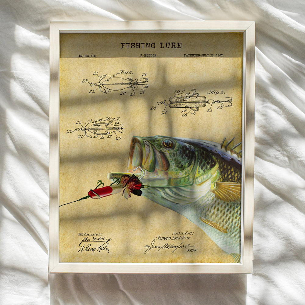 Fishing Patent Print - Fish Wall Art Poster - Rustic Vintage Home Decor for Beach or Lake House, Man Cave, Living Room, Office - Gift for Bass Fishermen, Anglers - 8x10 Photo Unframed